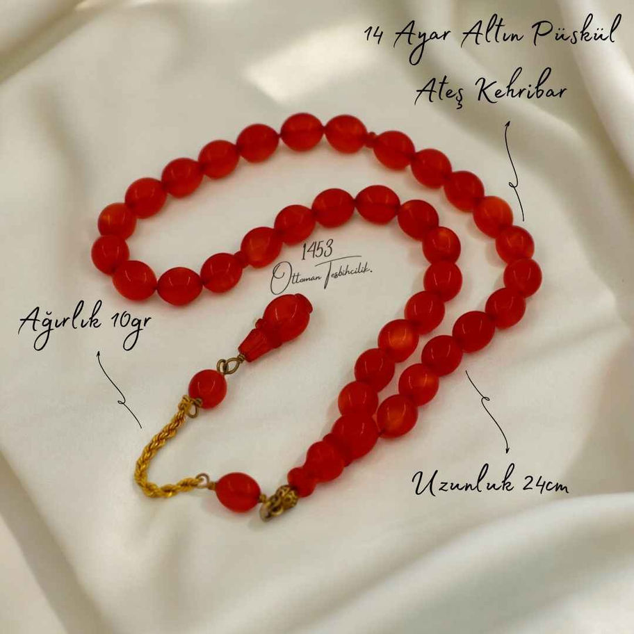 14 Ayar Altın Püsküllü Kırmızı Ateş Kehribar Tesbih", lüks ve etkileyici bir tasarıma sahip özel bir tesbihtir. Her bir tanesi, 14 ayar altın ve kırmızı ateş kehribarın uyumlu bir kombinasyonunu sunarken, ruhunuza ışıltı ve canlılık katmaktadır. Bu tesbih, hem değerli madenleri sevenler hem de estetik değerleri takdir edenler için mükemmel bir seçimdir. 14 ayar altın püsküllü kırmızı ateş kehribar tesbih, lüks ve doğanın güzelliğini bir araya getirerek her anınıza özel bir dokunuş sunar. Şıklık ve değer arayanlar için ideal olan bu tesbih, ruhunuza ferahlık ve neşe katmaya hazırdır.